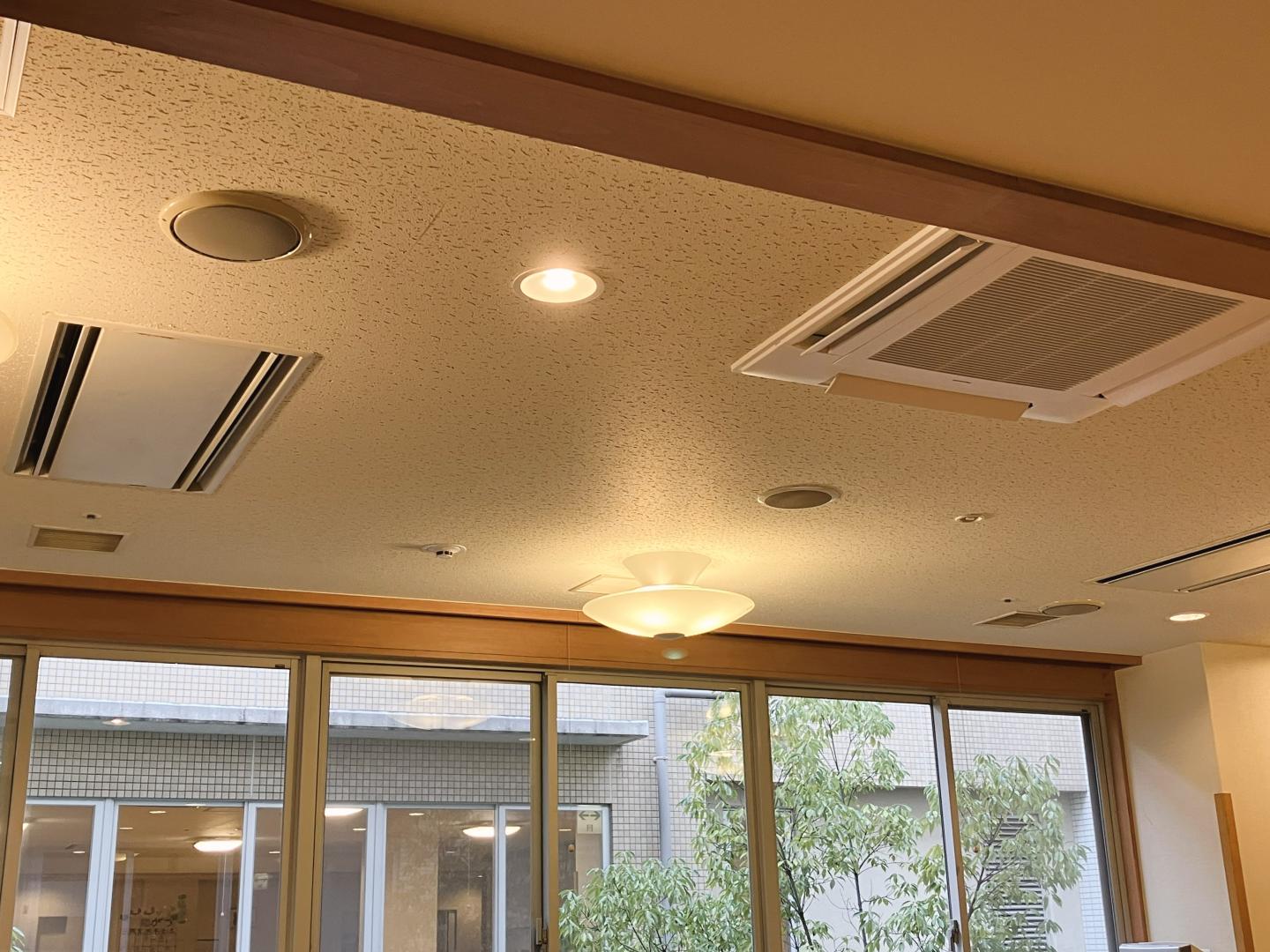 パープルユニットはフローラの西側にあるコミュニティです。毎年、夏場になると東側からの朝日と夕方の西日が強く、食堂を含めた居住空間の気温が下がらないことに悩まされていました。年々、暑さが増していきクーラーを入れた状態でも室温が下がらないため、事務員の協力のもとパープルユニットに新しくエアコンを設置しました。今までカーテンを閉めても暑さが和らがなかったのが、カーテンを開けていても快適に過ごせるようになりました。